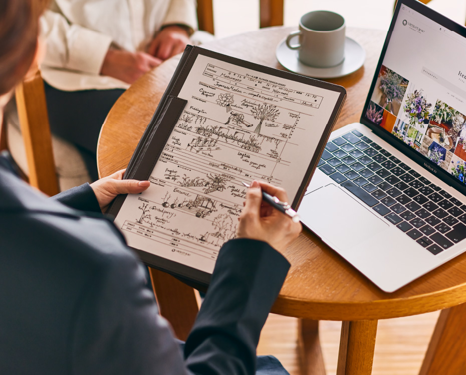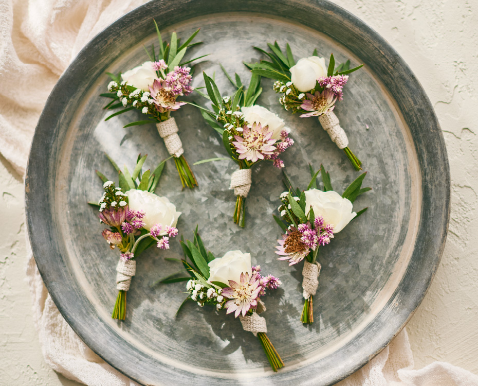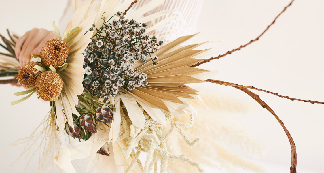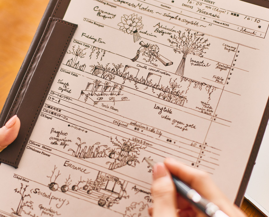 おふたりのイメージを伺いながら個々のアイテムをご提案します。お召しになるドレスや会場の雰囲気・季節・時間を考慮しながら、個のアイテムがトータルにまとまるよう全体のコーディネートを組み立てます。おふたりのご希望に沿いながら、さり気なくトレンドを織り込み本質的な美しさを追求する。その日その時間その場所にしかない結婚式を私たちブレス・エット・ロゼがお手伝いします。