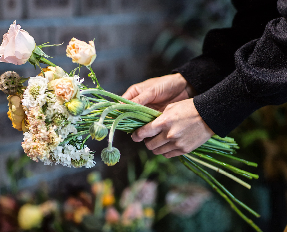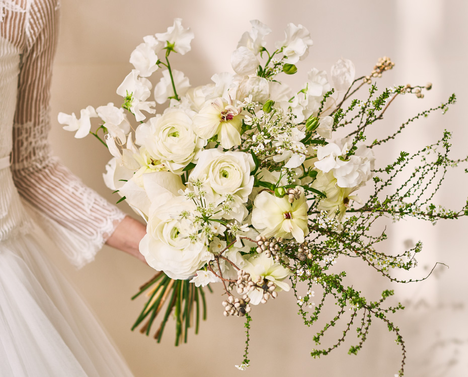 ブーケを手にして、花嫁のスタイリングは完成します。この世でたったひとつの花嫁自身の本質的な美しさを追求してほしい。その美しさを最大限引き出したい、私たちはいつもそう願っています。そのためにはあえて満開の花ではなく蕾のままをご提案することも。花の魅力を最大限に生かし、お届けした瞬間の笑顔を想像しながら心を込めて。ブーケ単体でのデザインではなく、ドレス、アクセサリー、タキシード、それらすべてを美しくまとめる最良のブーケを。