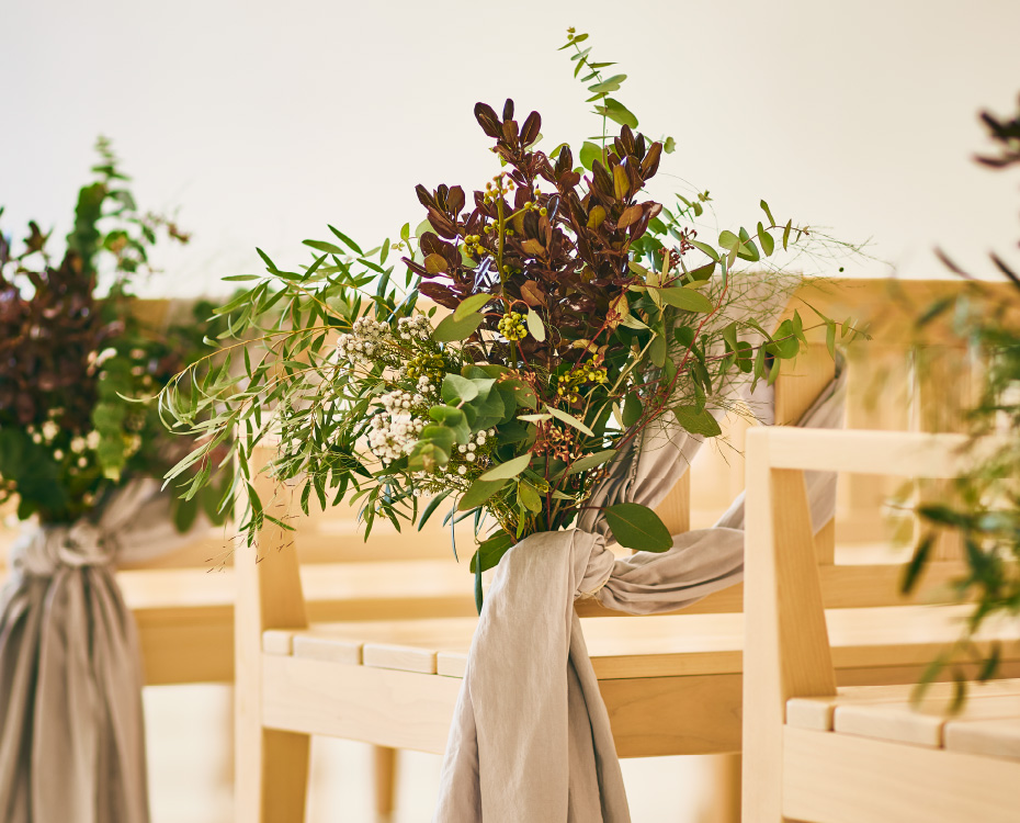 おふたりが真摯に永遠の愛を誓うチャペルでは、花は見た目の美しさだけではなく、香りでも神聖な雰囲気を生み出します。クラシックなデザインスタイルを念頭に置きながらも、挙式のスタイルやロケーション、ドレスのニュアンスや、おふたりのイメージを存分に取り入れて空間を設えます。ときにフォーマルに、ときにカラフルに。唯一無二のチャペルをコーディネートいたします。五感を刺激し、おふたりらしく彩られたチャペルでの誓いは、なによりも尊いものになるでしょう。